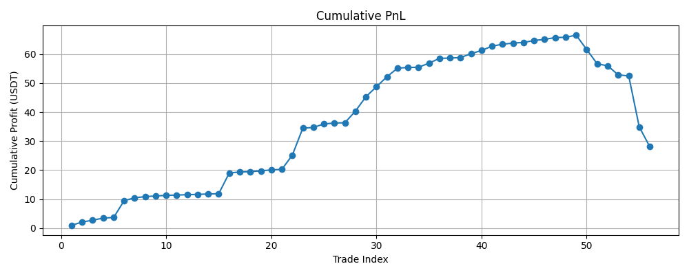 Posted in 实时动态量化交易日报 2025-11-24by 100wan•2025年11月25日•0 ⚠️ 投资有风险,入市需谨慎。 📅 报告生成时间:2025-11-24 20:24:44 📈 分析范围:最近 1 天 总交易笔数:56 总收益:28.096253 USDT 胜率:87.50% 最大回撤:38.444320 USDT 盈亏曲线 胜率分布 100wan More by 100wan